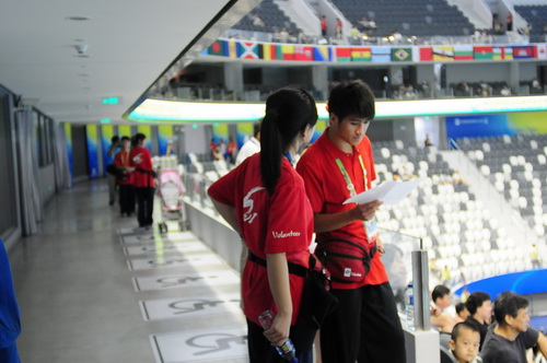 2011年7月16日,第14届国际泳联世界游泳锦标赛在上海东方体育中心“海上王冠”隆重开幕,我校全体世游赛志愿者承载着学校的嘱托和关爱整装上任了,他们传承着二工大志愿着精神,以饱满的激情、良好的精神风貌,踏上了世游赛联络官、国际联络部、场地器材部、观众服务、运行支持等5部门9大类165个服务岗位。