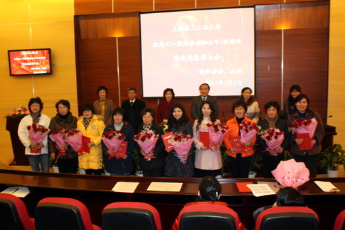 回顾激情飞扬的2010年,全校广大女性在各级党政领导的关心下,在校妇委会的团结带领下,在“三全”育人工作中彰显女性的智慧和才干,为学校的快速发展作出了积极的贡献,涌现出一批岗位建功的优秀女教授、女教工、女大学生。表彰会上,工会常务副主席严治俊宣读了三八表彰名单。高琪同志荣获上海市三八红旗手称号、外国语学院英语系荣获上海市教育系统三八红旗集体称号、胡珠媛等10位同志荣获校“三八红旗手”称号、环境学院绿色电子器件研发团队等3个团队荣获校“三八红旗集体” 称号、赵洋静等10位同学荣获校第四届“十佳女大学生”称号。在欢快的乐曲中,领导为她们颁了奖。