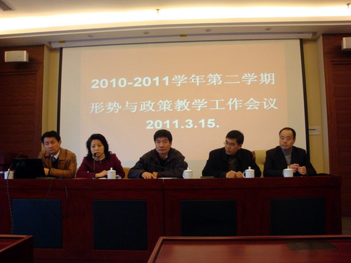 2011年3月15日上午,在图文信息中心叙述堂召开了2010-2011学年第二学期形势与政策教学工作会议,这也是本学期形势与政策课的集体备课活动,校党委副书记李世平,党委宣传部部长黎霞,学生处处长经晓峰,教务处副处长常小勇,思政部直属支部书记、校形势与政策教研室主任崔满明,各学院总支副书记、辅导员等共60人参加。党委宣传部部长黎霞主持会议,思政部直属支部书记崔满明代表校形势与政策教研室回顾上学期形势与政策教育教学工作的总体情况,对本学期的形势与政策教育教学工作进行布置安排。