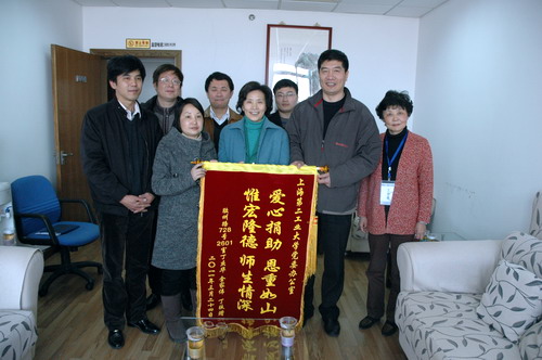 2011年3月24日,我校机电工程学院2009级丁轶同学的父母亲向学校赠送了一面书有“爱心捐助 恩重如山 惟宏隆德 师生情深”的锦旗,并送来一封感谢信,表达了对全校师生的感激之情。在去年“11.15”火灾中,丁轶一家受灾较重,学校及时向丁轶同学伸出援助之手。党委书记徐佩莉代表学校在第一时间向丁轶同学送去慰问,找他谈心,鼓励他战胜困难,勇敢面对一切。校学生处和机电工程学院的领导及丁轶同学的辅导员在第一时间来医院探望、慰问丁轶同学受伤的家人,机电工程学院还在全院组织了爱心捐款。党委办公室、组织部所在的支部还与丁轶同学结对,在去年严冬到来之际送去慰问信和冬被,并经常关心丁轶同学的学习。一段时间来,同学们也纷纷伸出援手,献出自己的一份爱心。所有这一切给了丁轶同学极大安慰和鼓舞。丁轶同学也表示要努力学习来回馈学校给予他的关心、帮助。