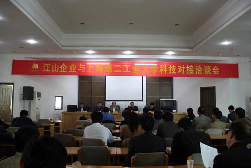 在14日下午的对接洽谈会上,瞿志豪副校长、陆建国主任和江山市副市长陆佩军分别致辞。瞿志豪副校长向与会的四十多位江山企业家介绍了我校的办学定位、学科特色和“拎包工程”,希望通过本次对接活动,双方建立起紧密的产学研合作关系。陆建国主任提出了上海高校技术市场对于促进建立校地产学研合作的规划,希望以江山为基地,使上海高校服务更多的浙江西南地区。陆佩军副市长希望江山的企业家能够积极与高校攀亲结缘,建立多种形式的技术合作关系,让上海高校江山产学研工作站结出更多的硕果。随后,我校电子与电气工程学院副院长汪志锋、计算机与信息学院副院长闫昱和机电工程学院副院长刘晓航向与会企业发布了学校的科技成果,并与企业老总及技术人员进行了“零距离”的接触洽谈。
