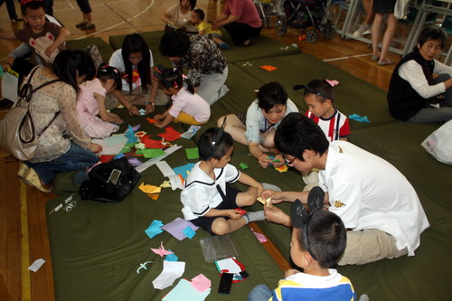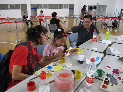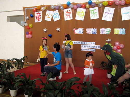 今年的亲子活动突出表现和培养孩子们的创造力和对美的感受力。活动分成五个板块:创意手绘面具、童真七彩沙画、开心巧手折纸、欢乐亲子派对、即兴童趣表演,称之为七彩学堂。孩子们一踏进体育馆,首先领取一个米奇尼的头饰,然后在家长的带领下选择自己喜爱的项目,构思、动手、琢磨、欣赏。一旁不仅有大学生的悉心指导,更有家长们的共同参与。特别在即兴童趣表演板块中,集聚了很大的人气,孩子们排着队等着上台展示自己的才能。在艺术学院陆奕、钱军两位同学的主持下,独唱、二重唱、讲故事、朗诵古诗、背诵儿歌轮番上阵。精彩纷呈的表演、落落大方的表现,赢得现场一片喝彩!