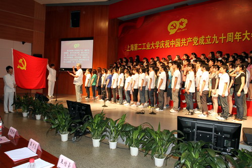 大会还进行了新党员宣誓和文艺表演,表达上海第二工业大学全体师生对党无比热爱、赞美和坚定的情怀。