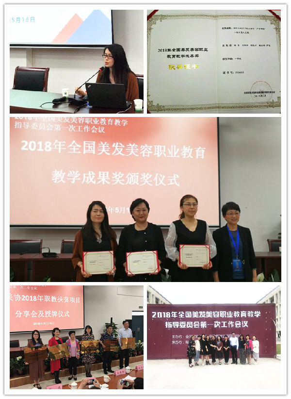 为期两天的会议议程安排紧凑,涵盖系列丰富活动,如:全美行指委2018年工作研讨、优秀教学成果奖交流汇报、美容、化妆、美发大师技术演示、专业教学标准制订及发布、职教扶贫项目分享会、中国美发美容职教集团成立揭牌仪式等。全美行指委教学成果奖是对全国高职学校和中职学校美业人才培养工作和教育教学改革成果的检阅和展示,每4年评选一次。会上正式公布了2018年全美行指委教学成果奖获奖名单,此次共评出2项特等奖、3项一等奖、5项二等奖。二轻校参评项目“国际化视野下校企协作产学研创一体化育人实践”荣获一等奖,这也是二轻校首次荣获全美行指委教学成果奖,二轻校滕琴副校长在会上作为代表进行交流发言。此次成果特别反映了二轻校美形专业在人才培养、校企合作方面工作的特色与成效,凝聚了学校教学工作者的集体智慧结晶,展示了美容美发专业教学改革和内涵建设突破。
