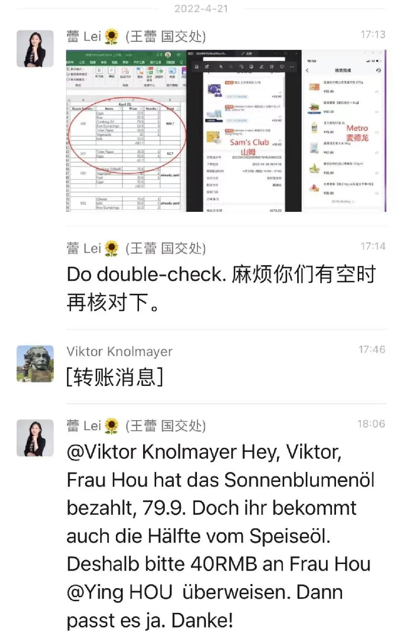 德国中心工商贸易园区大部分住户来自境外,包括德国、奥地利、美国和中国香港地区等国家或地区,其中有些住户因为不会使用中文交流,遇到疫情期间无法购买生活用品等具体困难。我充分发挥德语和英语的语言优势,主动与住户沟通,了解其需求,为其联络采购生活必需品。针对目前浦东近一个月的封控,特别是不会中文,家里还有小朋友的家庭难免出现焦虑情绪。我及时和相关住户电话沟通,第一时间向其转达上海发布、浦东发布等官方渠道的防疫信息,实时回应他们的咨询,安抚其情绪。能为身在异乡的他们带来生活保障和踏实感,我的内心也充溢着成就感,我也经常感受到整个社区的团结和温暖,因为抗“疫”无国界。