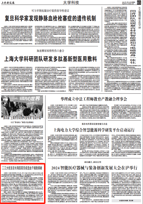 《上海科技报》:二工大校友在长海医院完成造血干细胞捐献