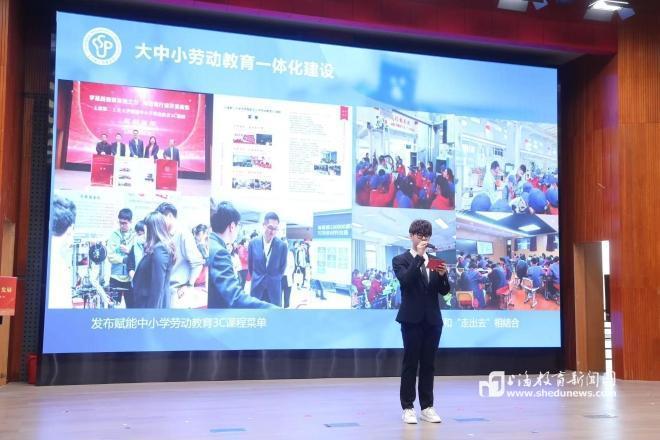 “文化浸润社区 劳动塑造美德”之社区美化成果展示环节,展示了二工大将劳动教育与一站式社区建设有机结合,因地制宜开展学生社区楼宇空间美化劳动实践活动,创设劳动文化氛围浓郁的社区育人环境。“赋启蒙教育 拓职业人生”之大中小劳动教育一体化课程展示环节,展示了二工大为进一步上好劳动育人这堂“大思政课”,积极探索建设大中小一体化劳动教育课程,发布赋能中小学劳动教育“3C”课程菜单,与进才中学(北校)、龚路中学等中小学合作,开展40余门课程,服务近5000名中小学生的成果。
