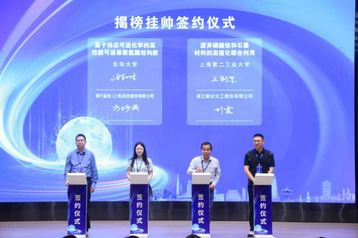 在揭榜挂帅现场签约仪式上,中国矿业大学和江苏中岩岩土工程有限公司签约了“矿井水智能预警防治系统”项目;浙江大学和上海电气风电集团有限公司签约了“浙江大学—上海电气风电研发中心(第三期)”项目;安徽大学和上海芯联科电子科技有限公司签约了“面向智能芯片的海量时序报告统计与特征分析工具设计”项目;东华大学和有行鲨鱼(上海)科技股份有限公司签约了“基于动态可逆化学的高性能可返修聚氨酯结构胶”项目;上海第二工业大学和浙江新化化工股份有限公司签约了“废弃磷酸铁和石墨材料的高值化综合利用”项目。