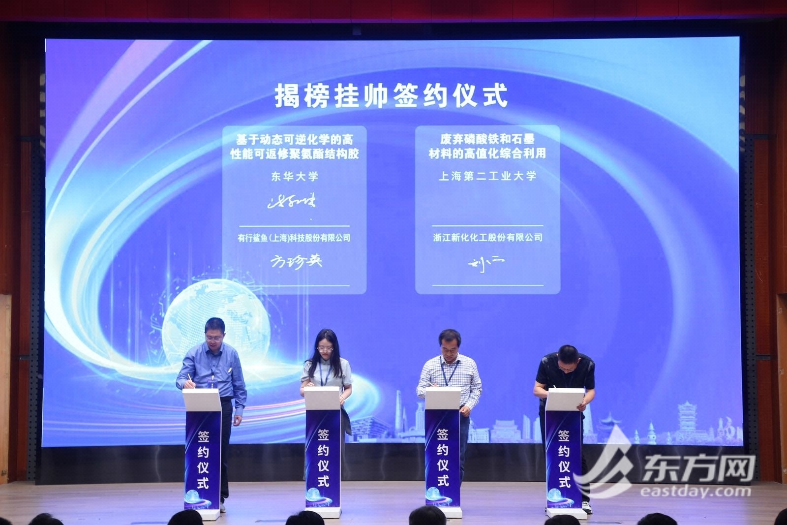 当天,在揭榜挂帅现场签约仪式上,中国矿业大学和江苏中岩岩土工程有限公司签约了“矿井水智能预警防治系统”项目;浙江大学和上海电气风电集团有限公司签约了“浙江大学—上海电气风电研发中心(第三期)”项目;安徽大学和上海芯联科电子科技有限公司签约了“面向智能芯片的海量时序报告统计与特征分析工具设计”项目;东华大学和有行鲨鱼(上海)科技股份有限公司签约了“基于动态可逆化学的高性能可返修聚氨酯结构胶”项目;上海第二工业大学和浙江新化化工股份有限公司签约了“废弃磷酸铁和石墨材料的高值化综合利用”项目。