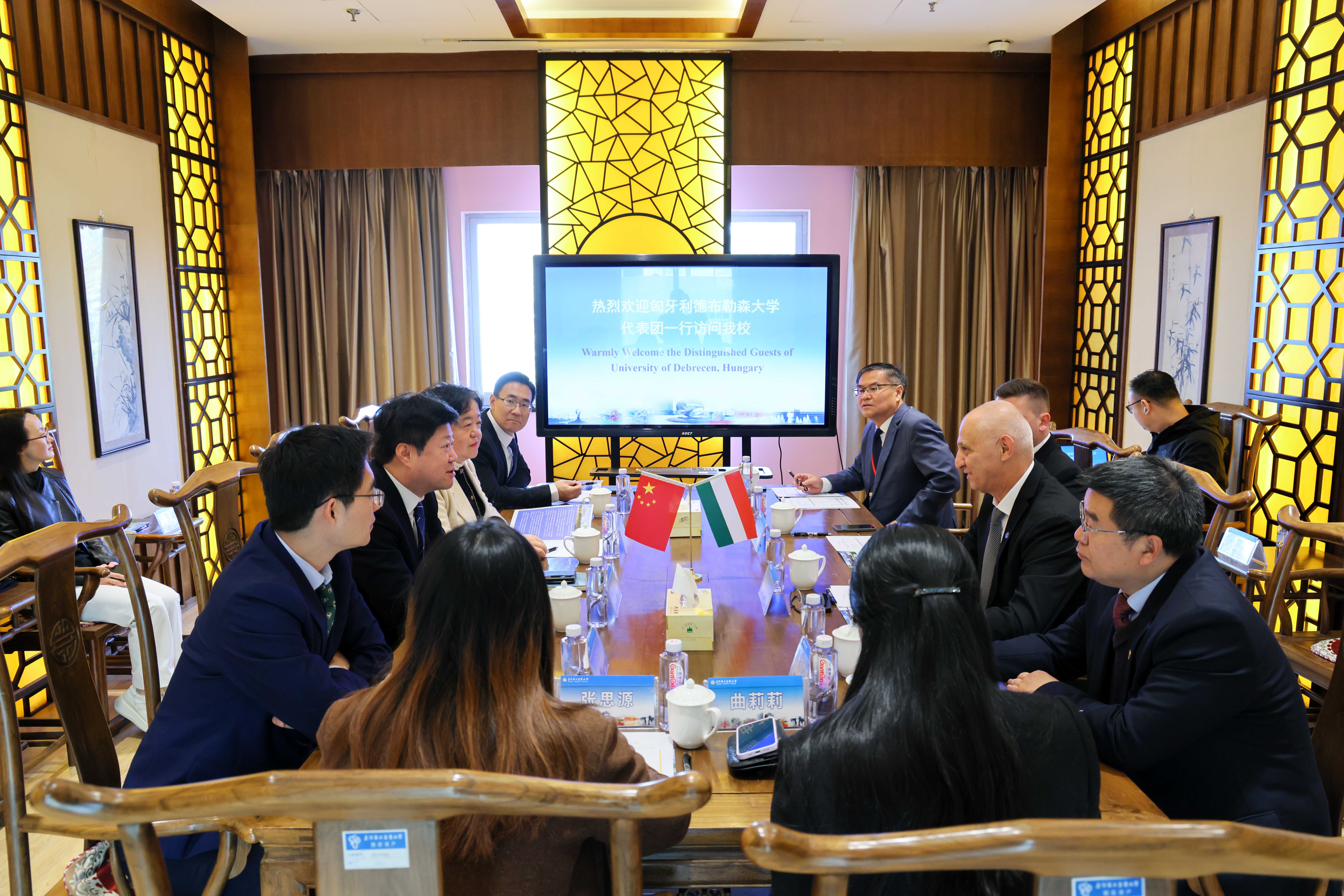 丁彬与代表团一行举行会谈。他表示,两校自建立合作以来,一直保持友好往来与密切交流。他对德布勒森大学积极参与“一带一路”合作并取得丰硕成果表示赞赏,期待双方未来共同申报更多政府间科研合作项目,深化人才交流,积极推进学生联合培养,促成更多实质性合作落地。