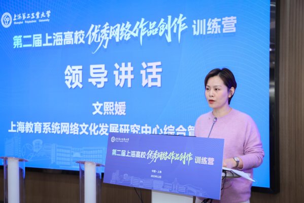 文熙媛代表上海教育系统网络文化发展研究中心对本次训练营的顺利召开表示祝贺,对我校的精心筹备表示感谢。她指出,网络内容创作要坚持正确导向,用党的创新理论统领创作;要把握时代脉搏,以AIGC等前沿技术赋能作品创新;要深化协同创新,构建校际合作、师生互动的网络育人新格局。