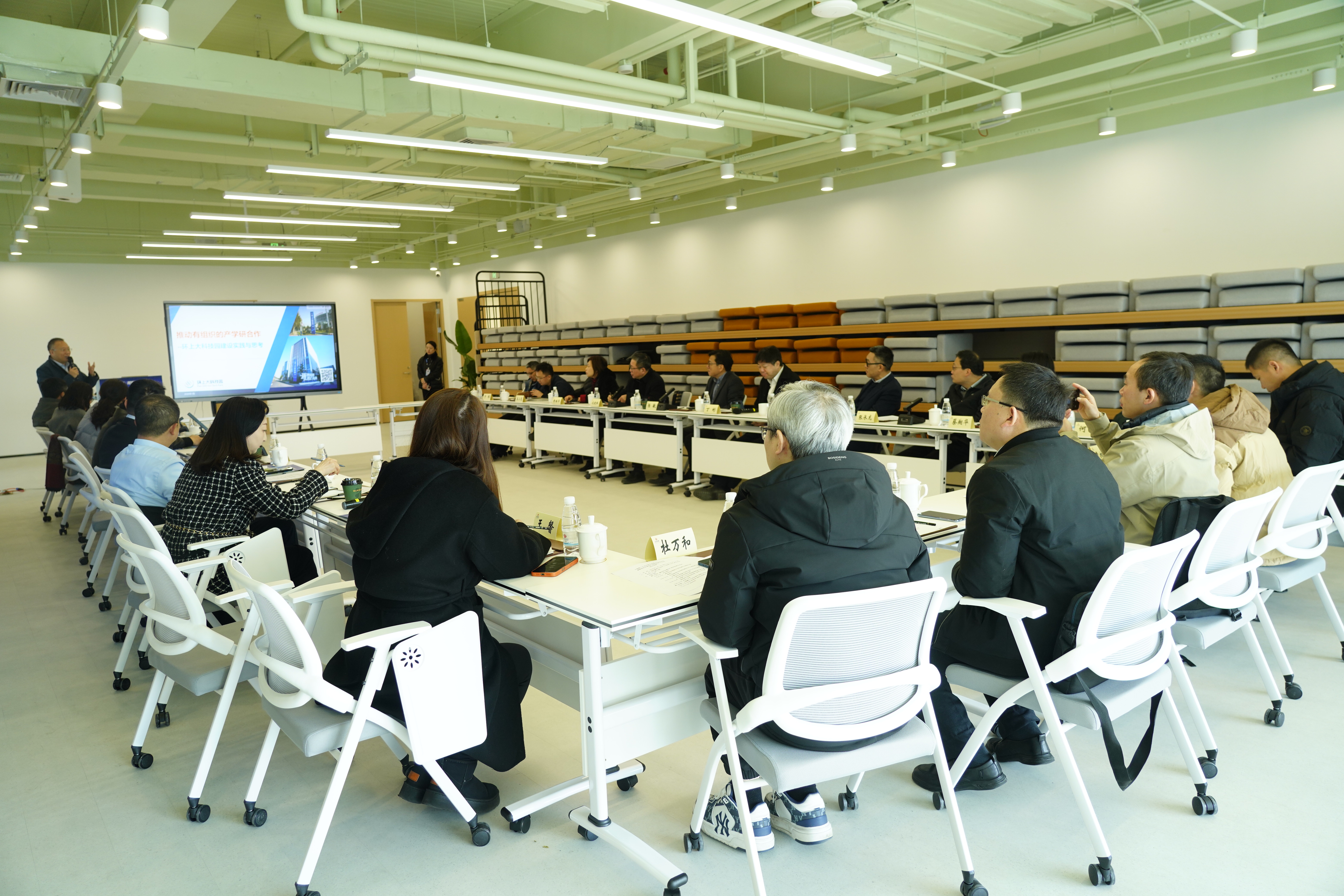 静安区科技与经济委员会副主任张永鹏作了成果转化政策宣讲,详细解读了静安区在支持科技创新与成果落地方面的政策举措。静安区市北高新股份总经理马慧民介绍了市北高新园区的发展现状与未来规划,展示了园区作为科技创新高地的载体功能与服务优势。李宇阳结合上海大学科技园运营实践,分享了环上大科技园在有组织推动产学研工作方面的思考,特别介绍了优化资源配置,促进创新链与产业链融合,教育与产业需求对接等方面的经验。智控学院杨敬辉教授介绍了武义智能制造产业技术研究院五年来在科研攻关、人才培养与社会服务等方面的实践与思考。