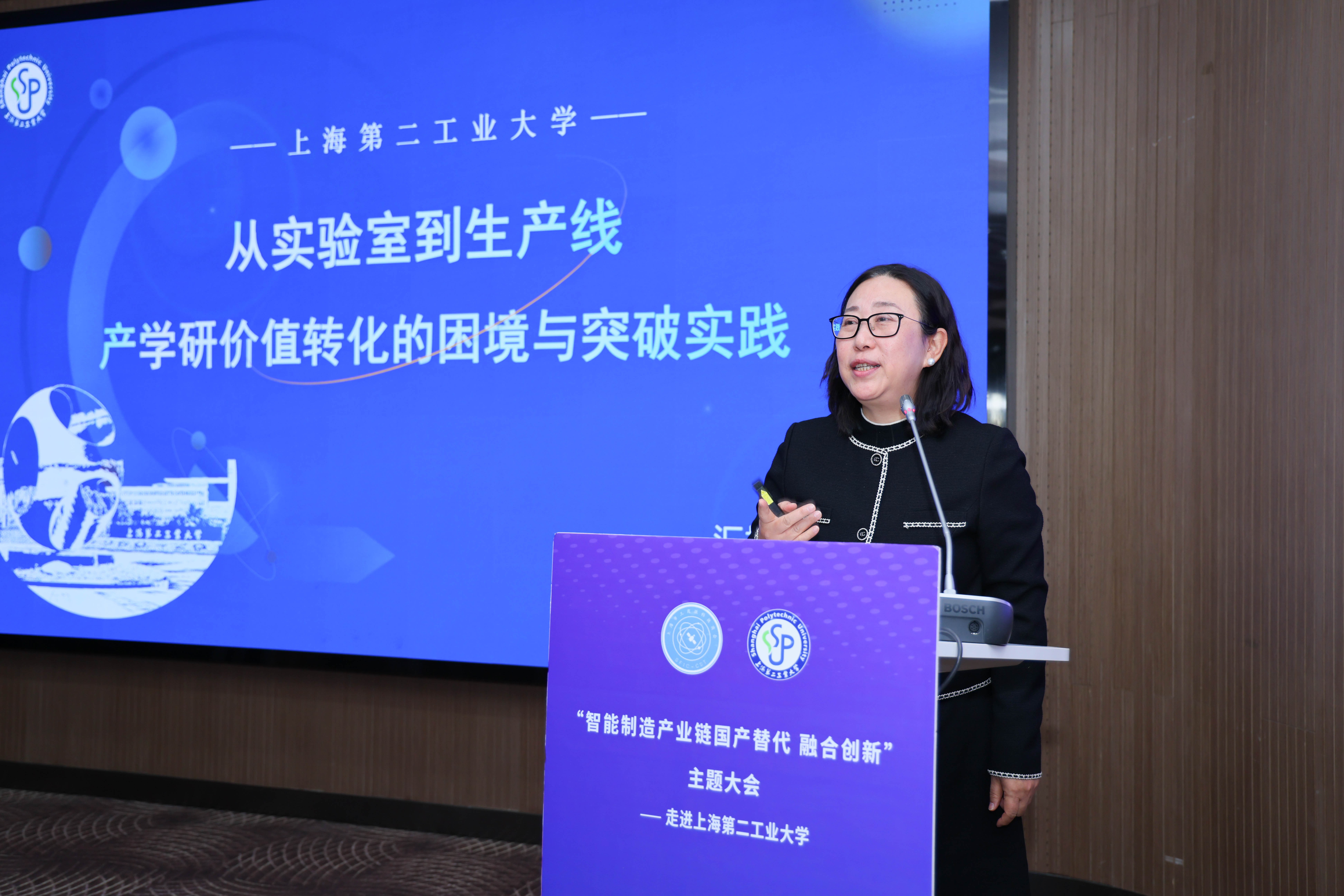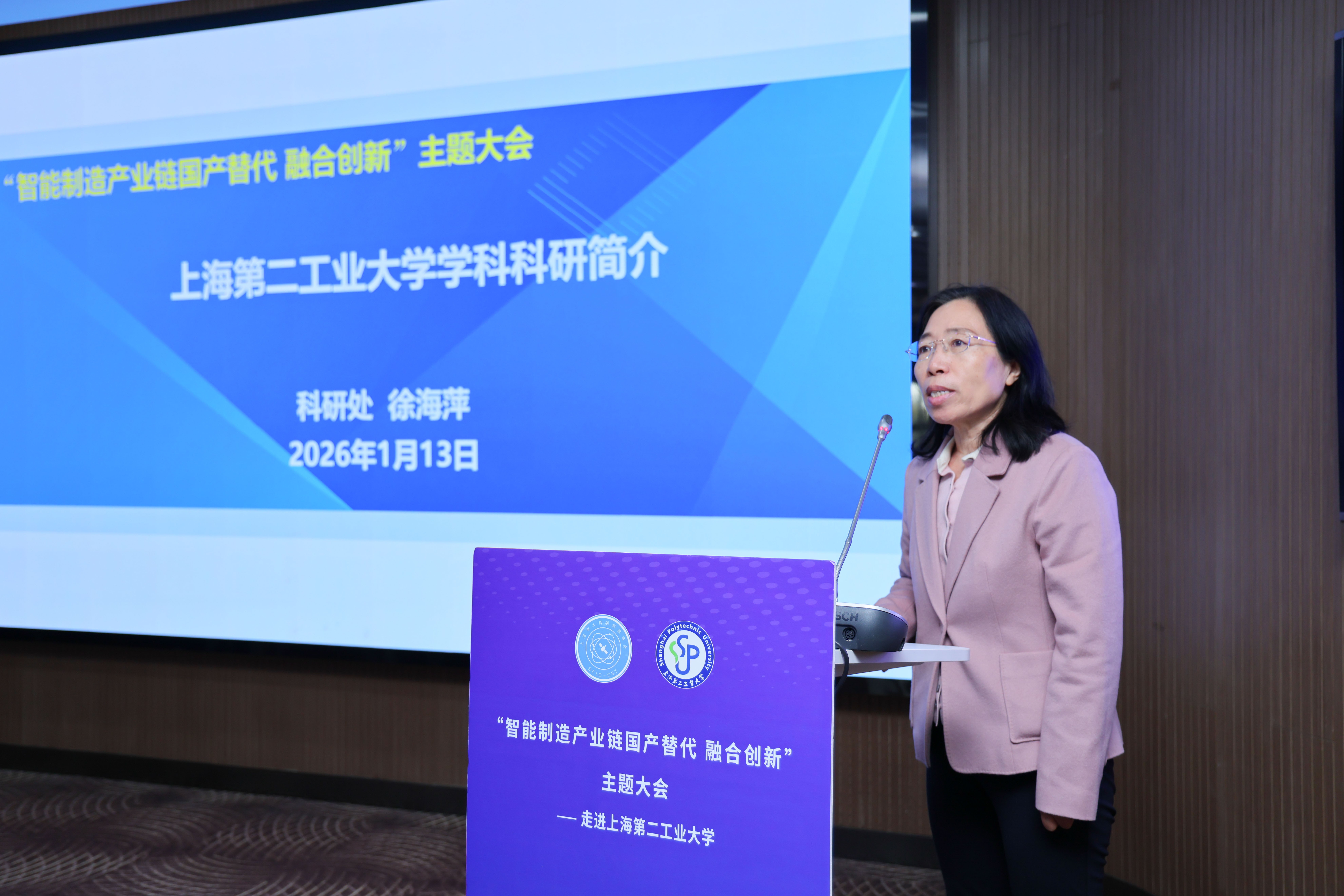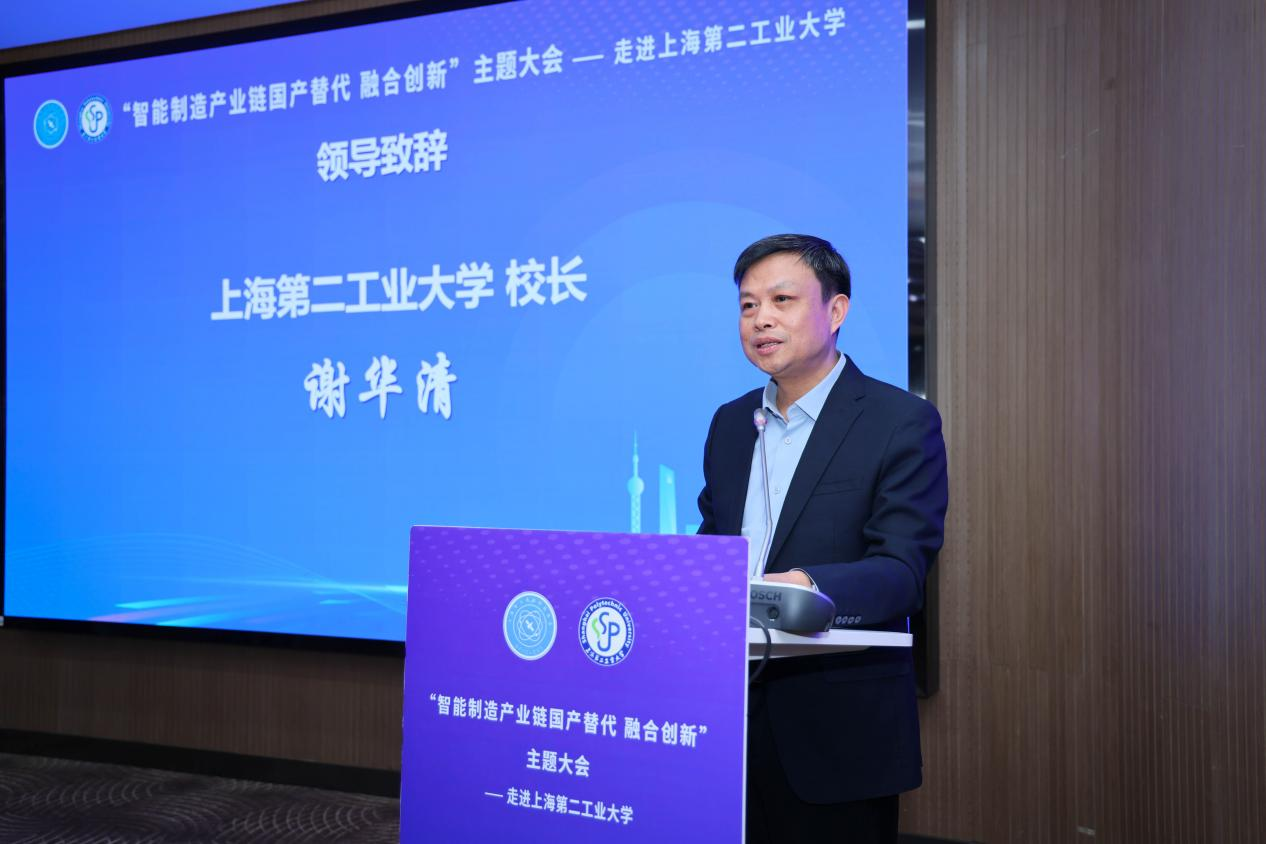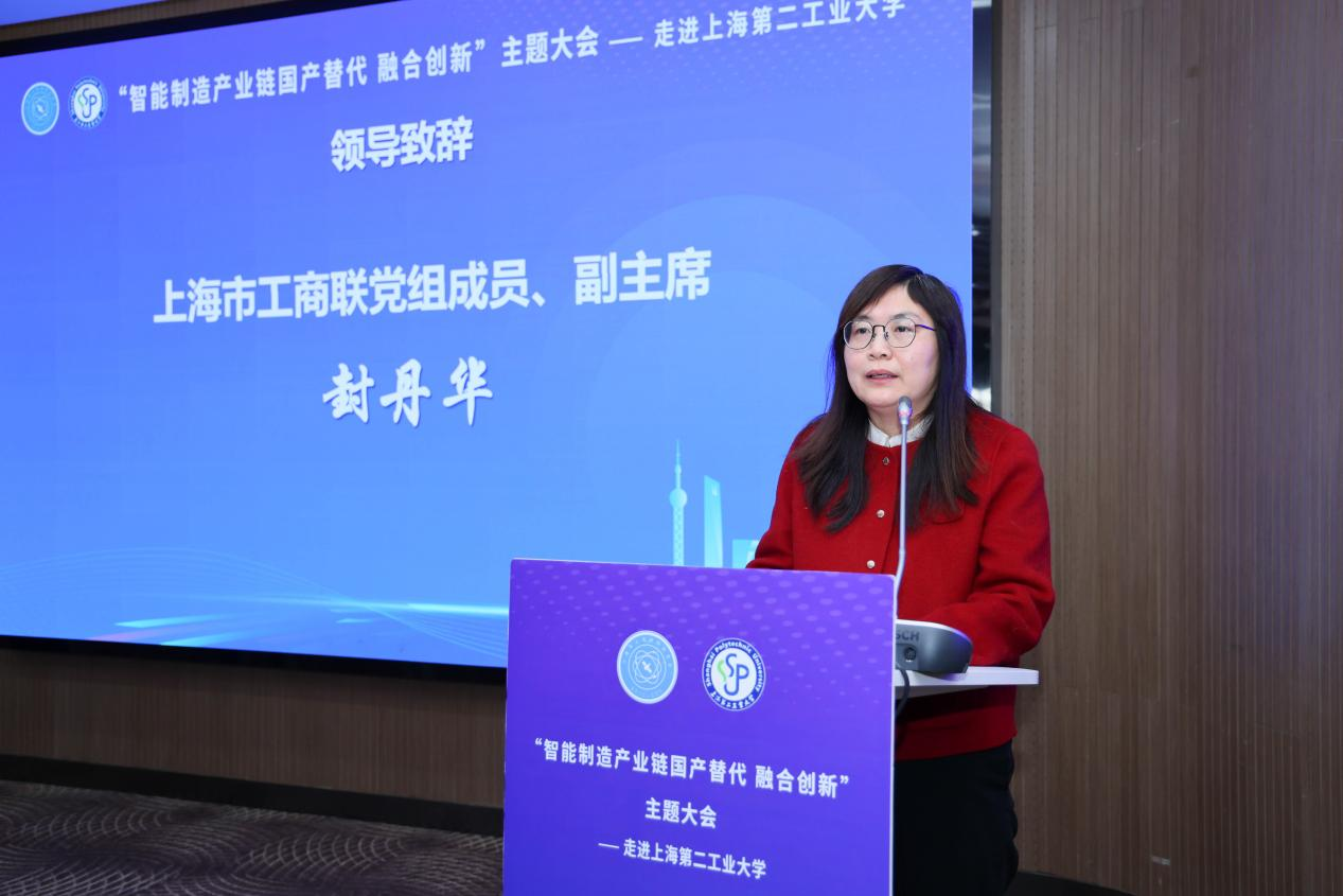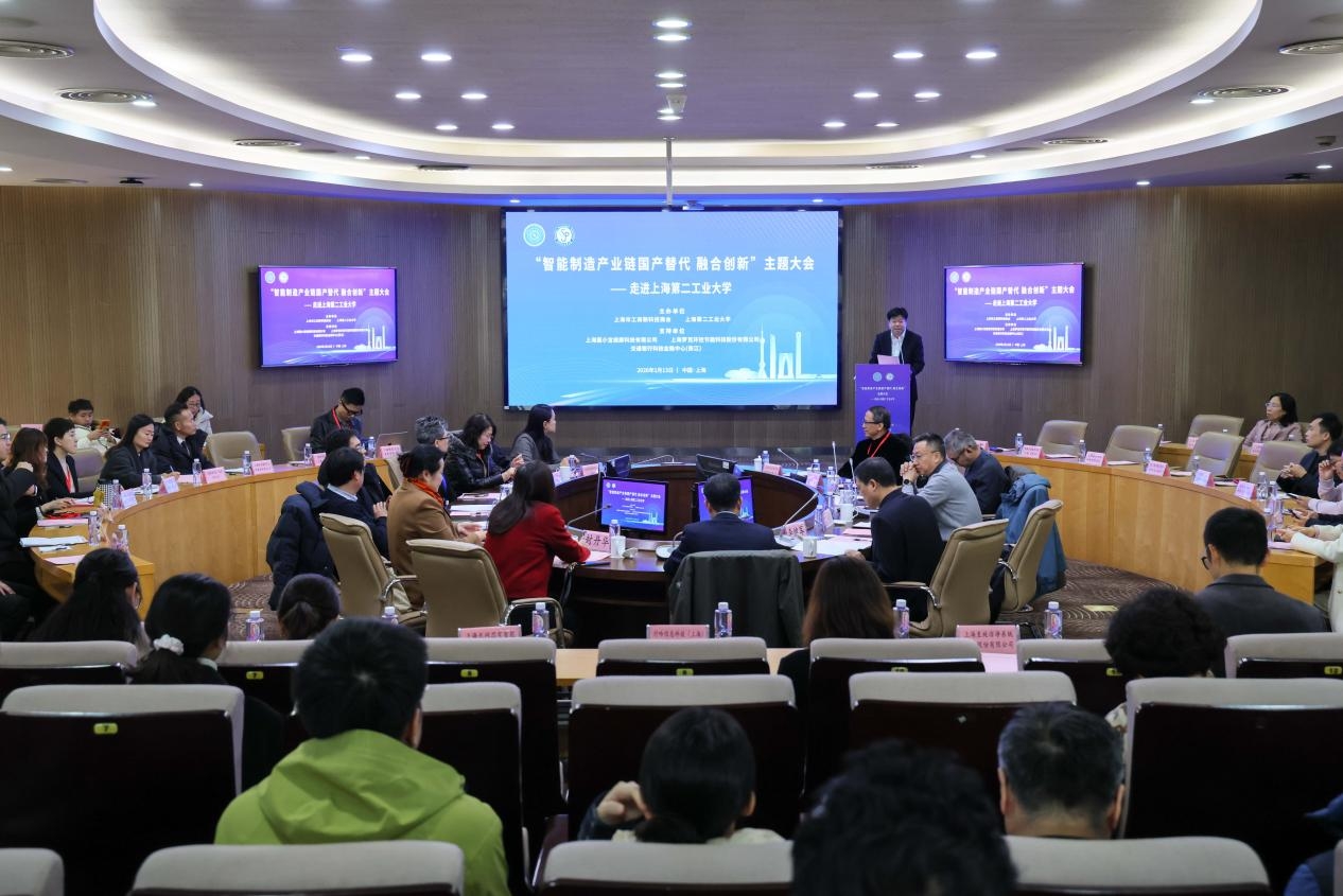 1月13日上午,由上海第二工业大学与上海市工商联科技商会联合主办的“智能制造产业链国产替代 融合创新”主题大会在学校学术交流中心举行。本次大会旨在服务智能制造产业链、供应链的自主可控,搭建校企合作协同创新桥梁,推动科技创新与产业发展的深度融合。来自相关行业的领导、百余家企业、学校相关职能部门负责人及教师代表参加会议。校长谢华清,市工商联党组成员、副主席封丹华出席并致辞。会议由副校长丁彬主持。