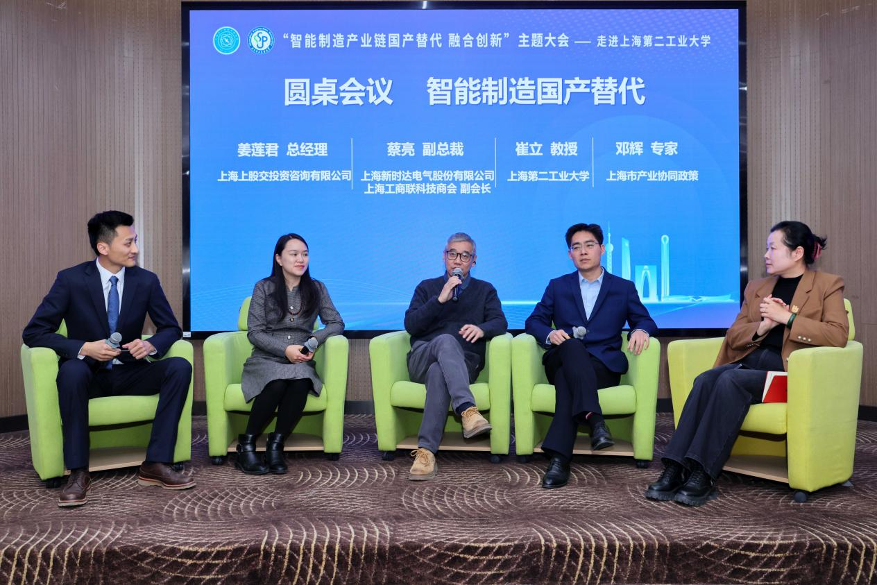 圆桌会议环节,我校崔立教授与上海上股交投资咨询有限公司姜莲君总经理,上海新时达电气股份有限公司、上海工商联科技商会副会长蔡亮副总裁,上海市产业协同政策专家共同围绕智能制造产业链国产替代融合创新主题展开了深入讨论,共同探索合作新路径,共谋发展新机遇。