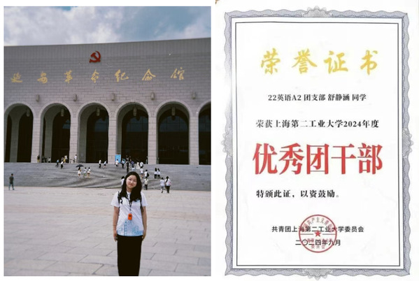 学业之余,舒静涵的成长之路同样精彩纷呈。作为上海第二工业大学第八期青年马克思主义者培养工程培训班的成员,她利用暑期前往陕西延安开展为期一周的研学活动,深入学习梁家河精神,产出5份实践报告,最终以“优秀学员”身份顺利结业。