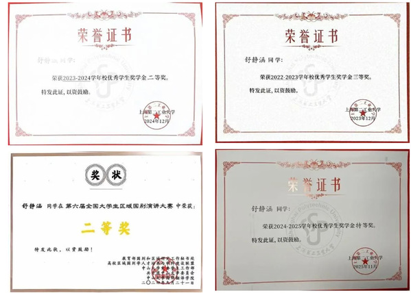 在学习方面,她始终秉持勤奋刻苦的精神,严格要求自己,凭借对目标的执着追求和对知识的强烈渴求,敏而好学、刻苦钻研,最终取得优异成绩。学年均绩为3.94,32门课程成绩达到90分及以上,绩点排名与综测排名均位列班级第一。她多次征战国家级学科竞赛并屡获佳绩。2024年9月,她代表学校参与第六届全国大学生区域国别演讲大赛,与来自北京大学、清华大学、中国人民大学、武汉大学、山东大学、北京外国语大学、外交学院、上海国际问题研究院等70余所高校及科研单位的240余名本科生、研究生同台竞技。该赛事覆盖面广,影响力大,受到人民日报、新华社等多家主流媒体报道。经专家评审,共有117名同学脱颖而出,入围2024年9月21日在中山大学广州校区南校园举办的复赛。经过激烈角逐,最终仅24名同学晋级决赛,淘汰率高达90%。决赛即兴演讲环节后,面对中国前中东问题特使吴思科大使、中国社会科学院拉丁美洲研究所原副所长江时学教授的提问,她从容应答,获得现场专家评审的一致好评,最终斩获全国二等奖。颁奖时,东南大学区域国别研究院院长王启龙教授也对其表现寄予高度评价。本届大赛上海市仅有四人获奖,其中包含两名研究生。