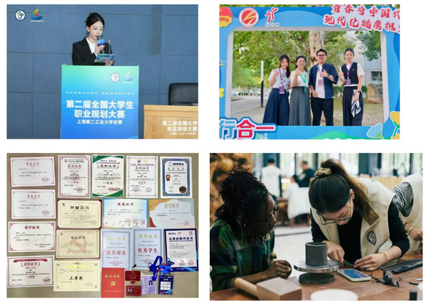 她积极响应学院“跨学科融合、以赛促学”的号召,不仅在英语、心理学等领域的竞赛中崭露头角,更在艺术设计赛道上大放异彩。2024 年,作品凭借独特的视觉语言和深刻的主题表达,荣获第七届大学生网络文化节上海市二等奖,参与的大学生创新创业项目获评市级优秀;2025 年,以对传统文化的创新诠释和对色彩美学的精准把控,一举拿下中国大学生文化创意设计大赛上海市一等奖、全国二等奖,同时斩获“知行杯”上海市大学生社会实践大赛一等奖、第十届“汇创青春”大赛上海市二等奖等多项荣誉。一次次创作与竞赛的锤炼,让她不断深化对艺术本质的理解,将设计思维与美学素养转化为创作动能,让每一次作品都成为专业能力的生动注脚。