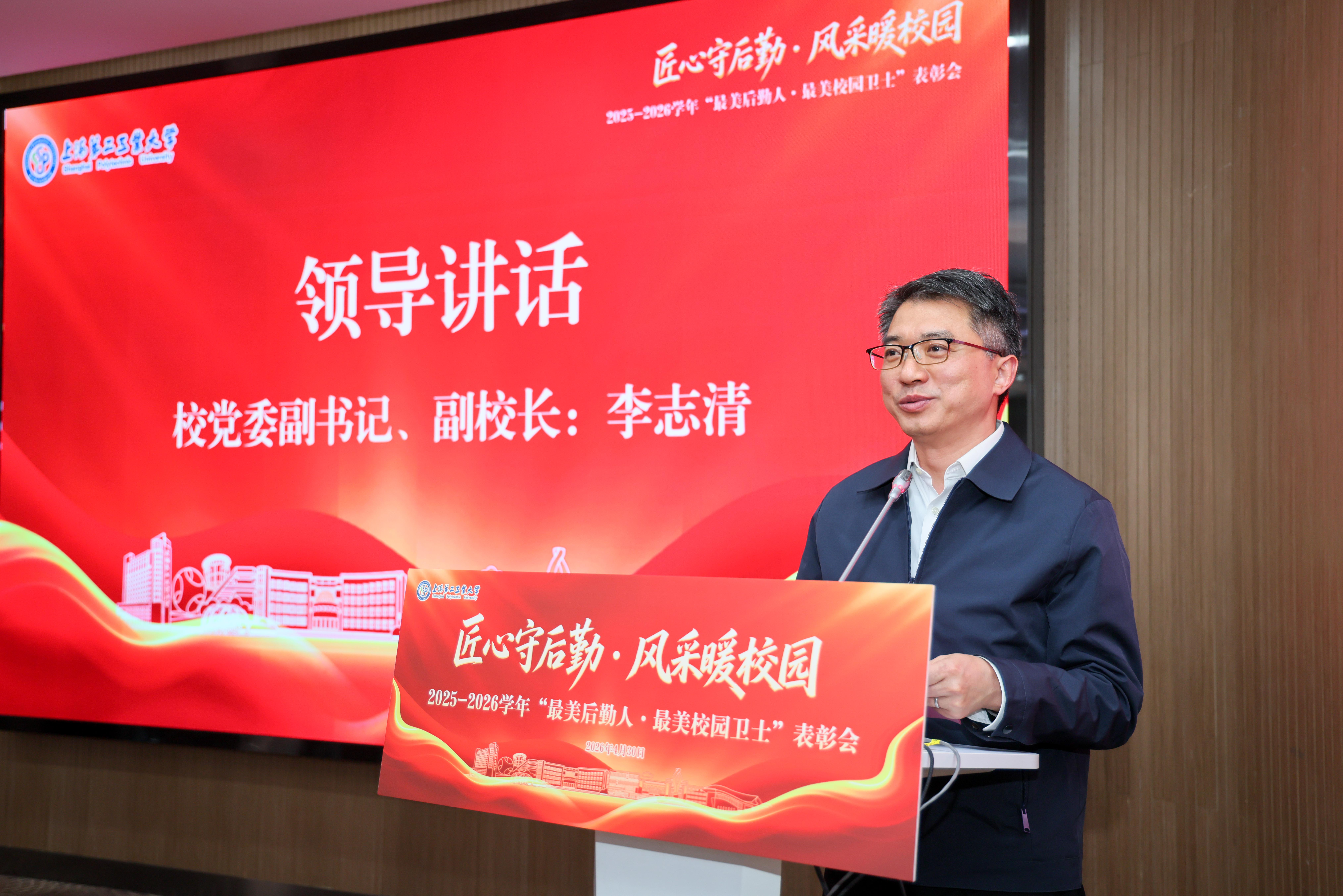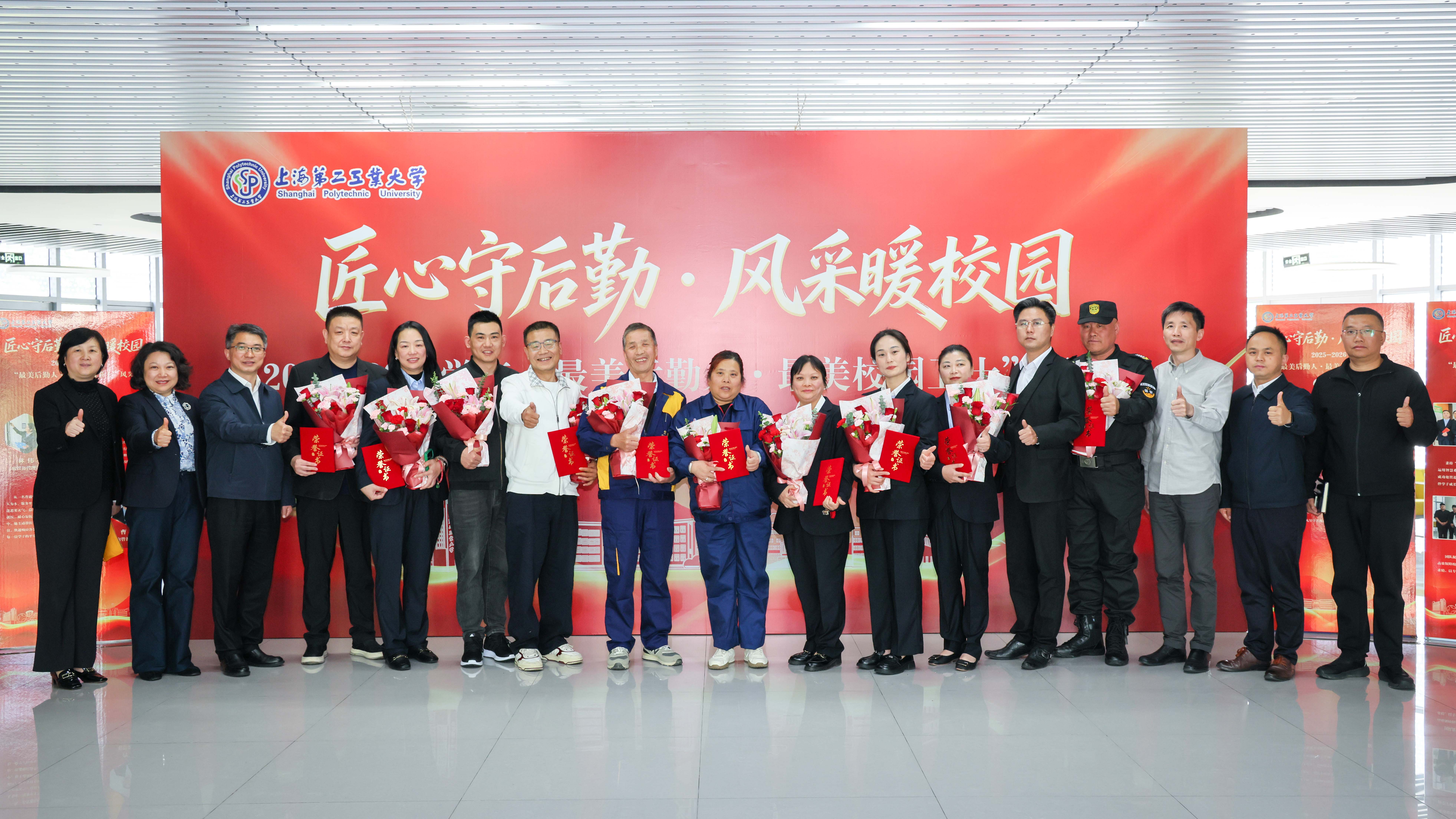 为大力弘扬爱岗敬业、无私奉献的精神,表彰校园服务保障与安全守护一线的先进典型,凝聚校园治理合力,4月30日下午,上海第二工业大学2025-2026学年“最美后勤人和最美校园卫士”表彰会在19号楼301会议室召开。校党委副书记、副校长李志清,党委宣传部、校工会、学(研)工部、保卫处、后勤服务中心及各社会服务单位代表、学生代表参加会议。会议由后勤服务中心主任邱钢主持。